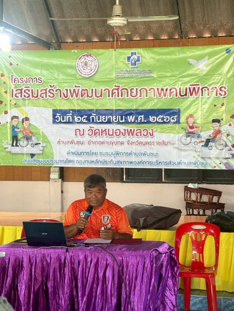 นายจเร เสขุนทด นายกองค์การบริหารส่วนตำบลพันชนะ ประธานเปิดโครงการเสริมสร้างพัฒนาศักยภาพคนพิการ ณ วัดหนองพลวง ตำบลพันชนะ อำเภอด่านขุนทด จังหวัดนครราชสีมา
