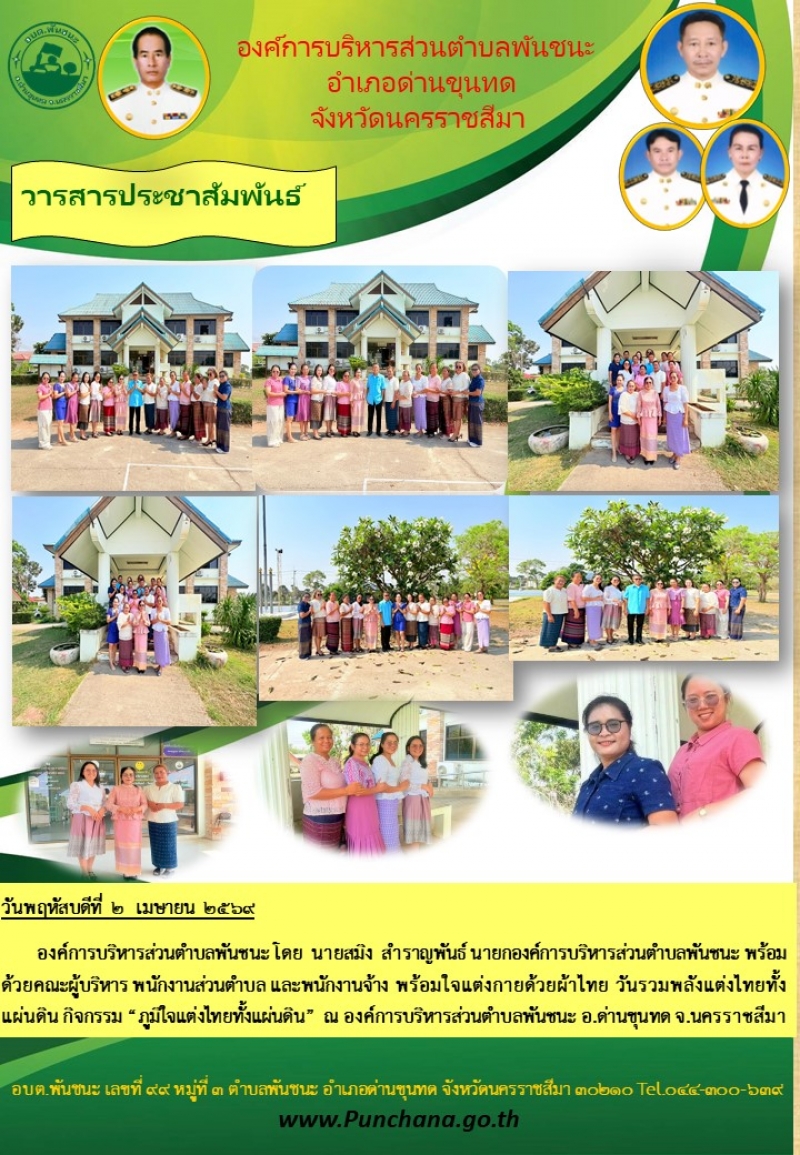 อบต.พันชนะ นำโดย นายสมิง สำราญพันธ์ นายก อบต.พันชนะ พร้อมด้วยคณะผู้บริหาร พนักงานส่วนตำบล พนักงานจ้าง พร้อมใจกันแต่งกายด้วยผ้าไทย รวมพลังแต่งไทยทั้งแผ่นดิน กิจกรรม "ภูมิใจแต่งไทยทั้งแผ่นดิน" ณ องค์การบริหารส่วนตำบลพันชนะ อำเภอด่านขุนทด จังหวัดนครราชสีมา