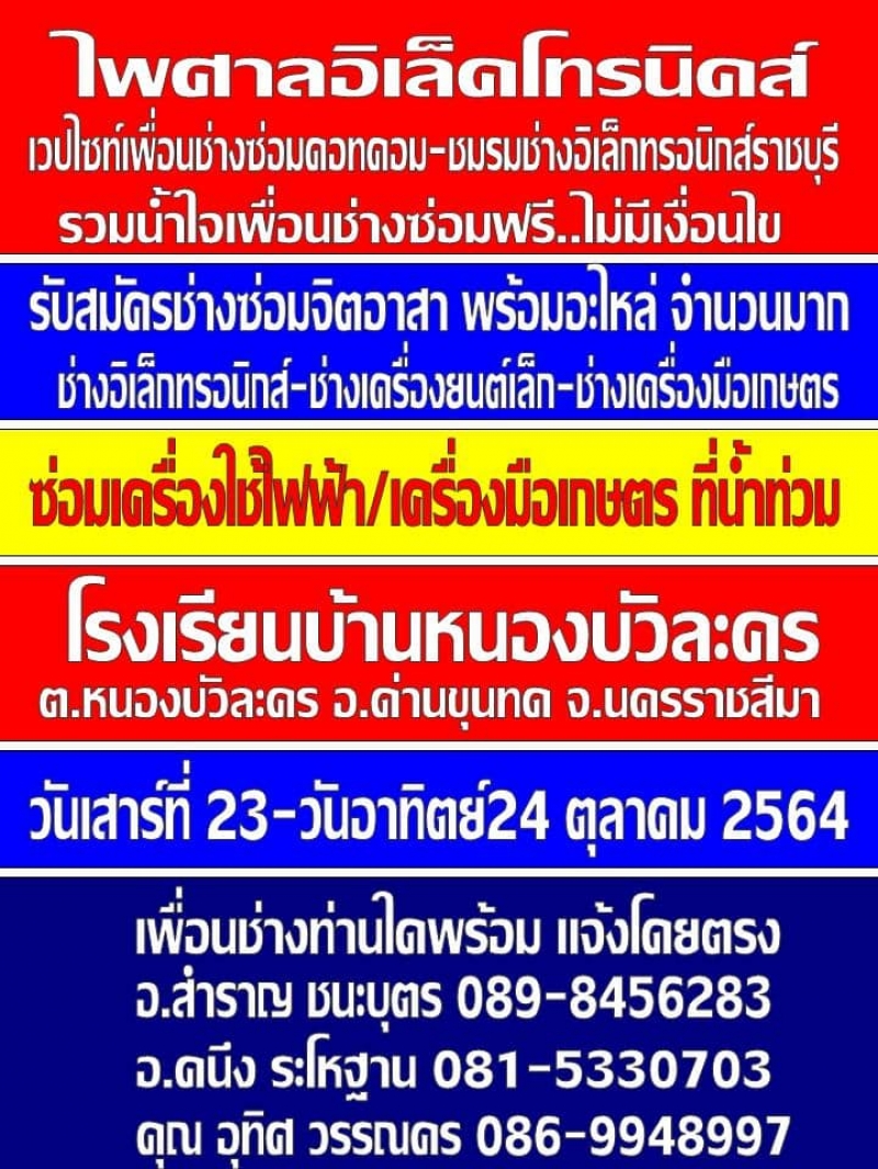 วันที่ 23 - 24 ตุลาคม 2564 ชมรมผู้พิการตำบลพันชนะ ร่วมกับเพื่อนช่าง อาสาซ่อมเครื่องใช้ไฟฟ้าฟรีเพื่อช่วยบรรเทาความเดือดร้อนของชาวบ้านจากน้ำท่วม ตำบลหนองบัวละคร